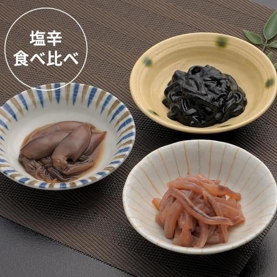 「いかの黒作り」「ホタルイカの沖漬け」「いかの塩辛(赤作り)」えびよねが誇る三大珍味をセットにしました。